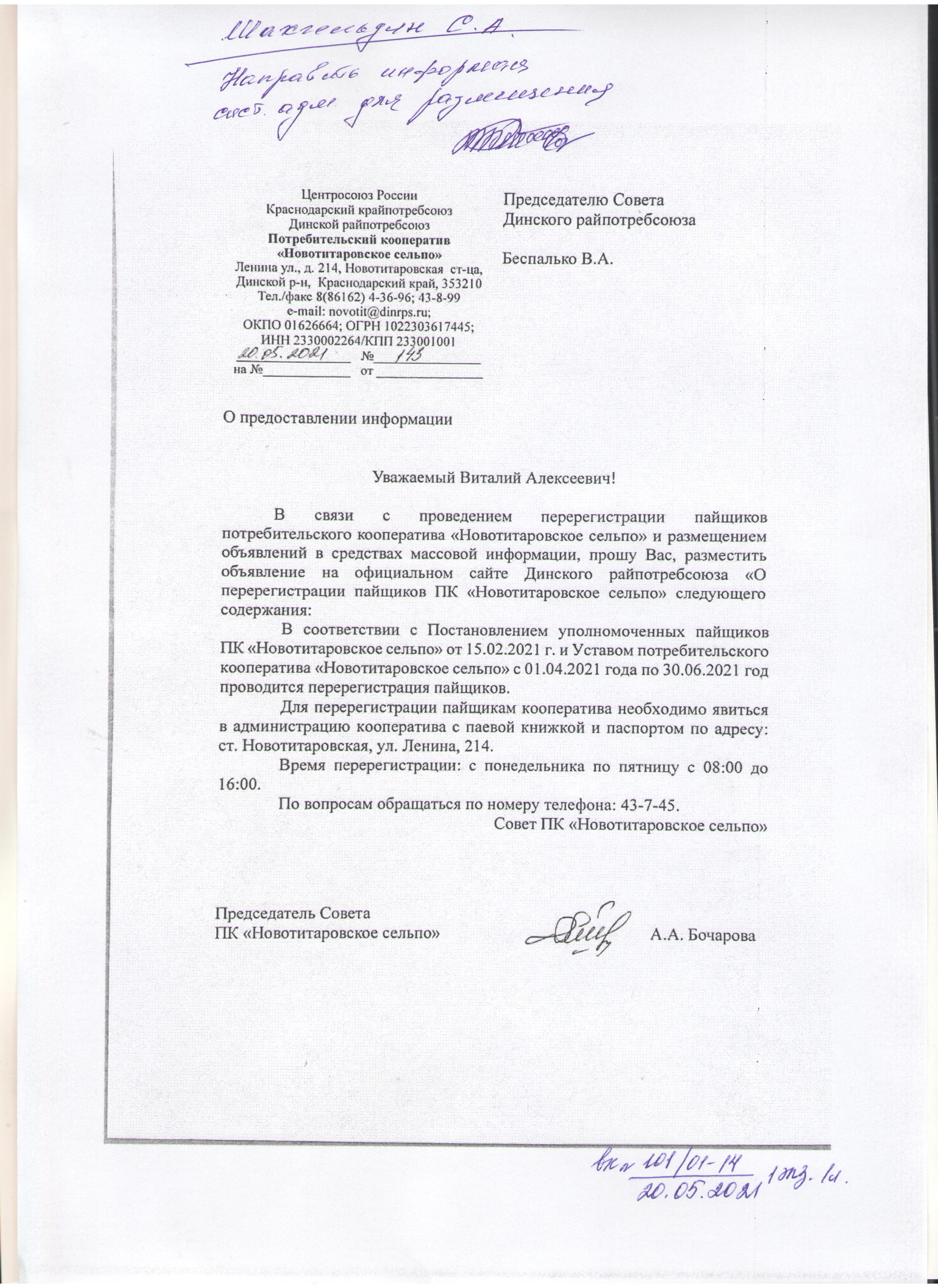 Для перерегистрации пайщикам кооператива необходимо явиться в администрацию кооператива с паевой книжкой и паспортом по адресу: ст. Новотиторовская, ул. Ленина, 214.